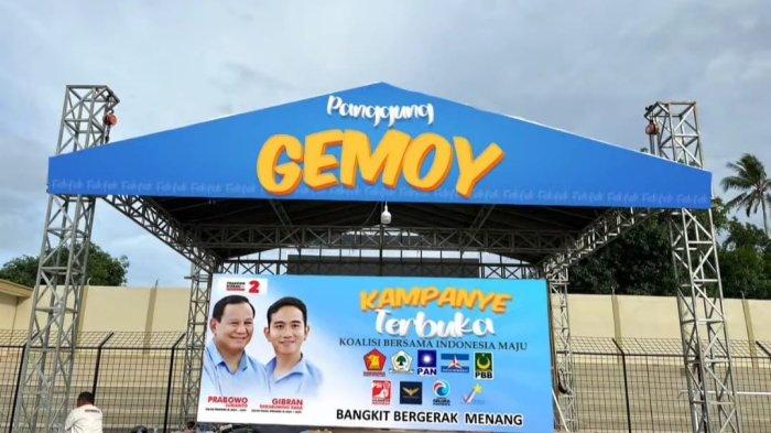 Panggung megah dengan karikatur Prabowo-Gibran serta goyang gemoy juga telah disediakan panitia di Stadion 16 November sebagai tempat acara.
